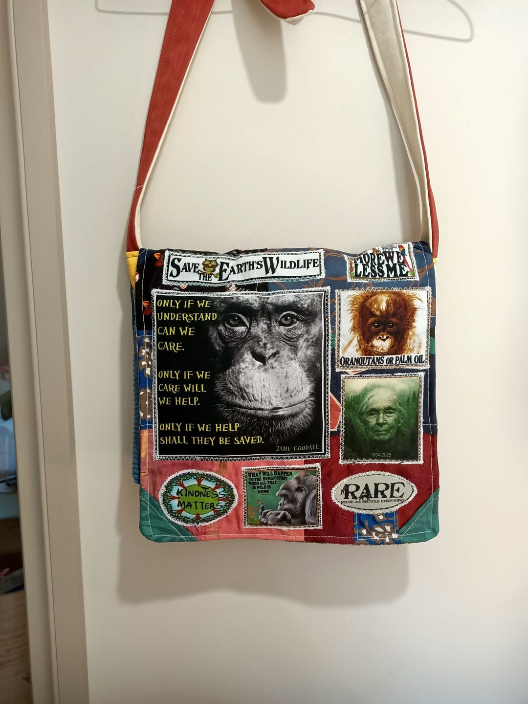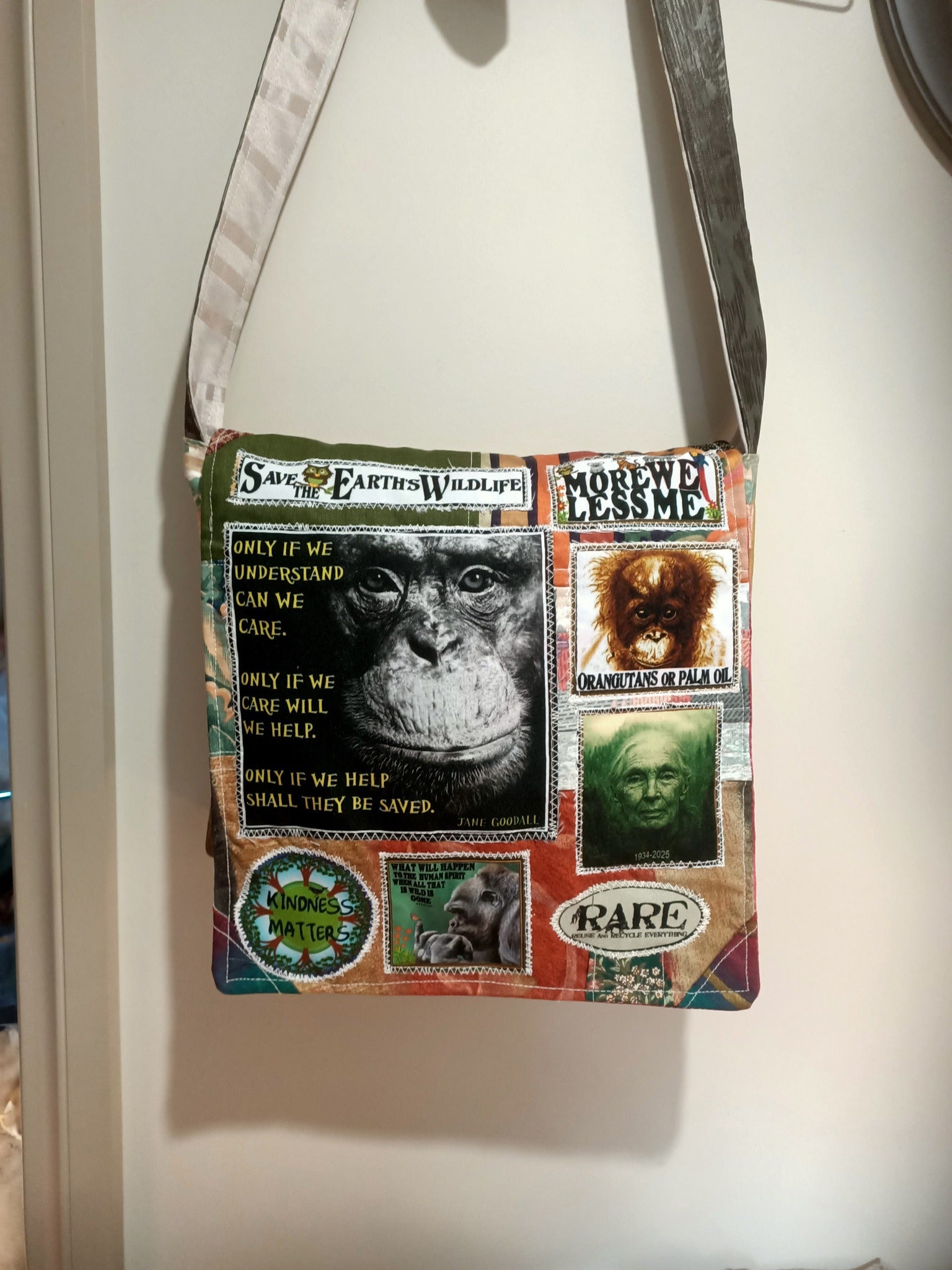 Here is the new Jane Goodall bag I just made..we lost a wonderful human being and I dip my lid to her(she had one of my bags)…raising awareness about the plight of the planets wildlife and ecosystems…what we do to the earth we do to ourselves..…By wearing one of my bags you are raising awareness and starting conversations…its an effective way to begin change…Hope you like it…For Australian customers this bag will be $105 when you get to the checkout.
